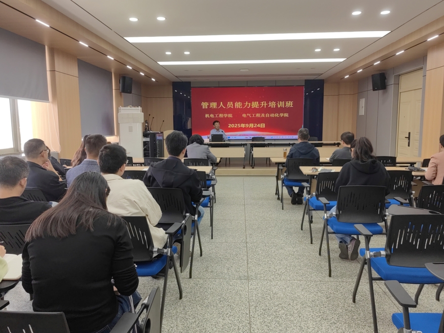 9月24日下午,电气工程及自动化学院、机电工程学院联合举办了管理干部能力提升培训班,会议邀请原工会主席潘永亮研究员做专题报告。学院全体管理人员、系主任、支部书记参加了培训,会议由机电学院党委书记姜南主持。