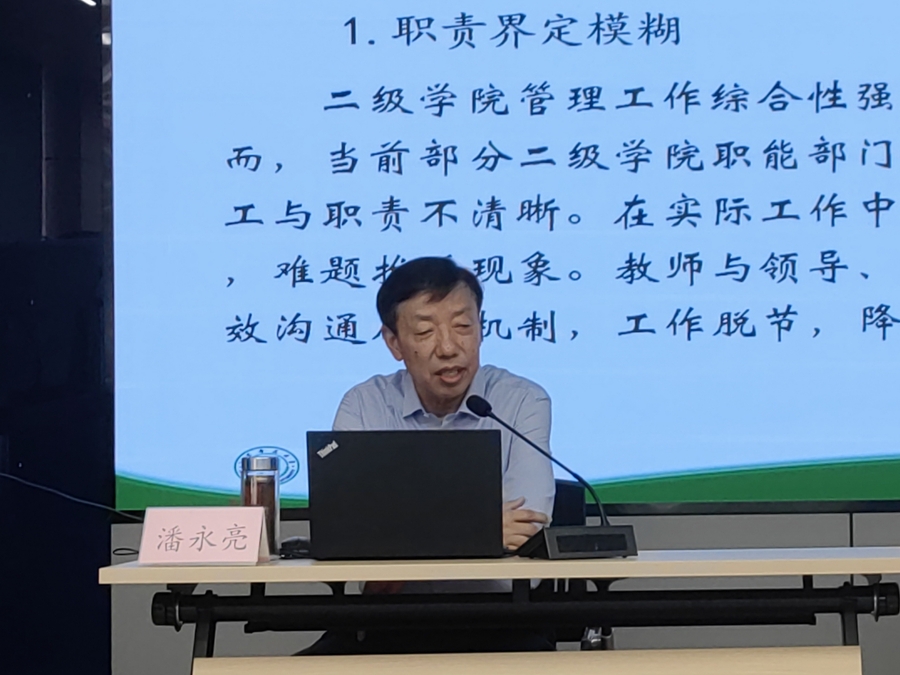 潘永亮以“融情怀于管理 以作风强服务”为主题,结合自己在工作中的体会,从学院发展、服务师生、能力自信等方面阐述了管理人员工作的动力源泉,结合工作实例剖析探讨了学院管理工作好作风的路径和细节。潘永亮倡导大家,作为一名优秀的管理人员,要善于将情怀与作风相融合,日复一日地坚守,做“有温度的服务者”,当“有担当的行政人”。