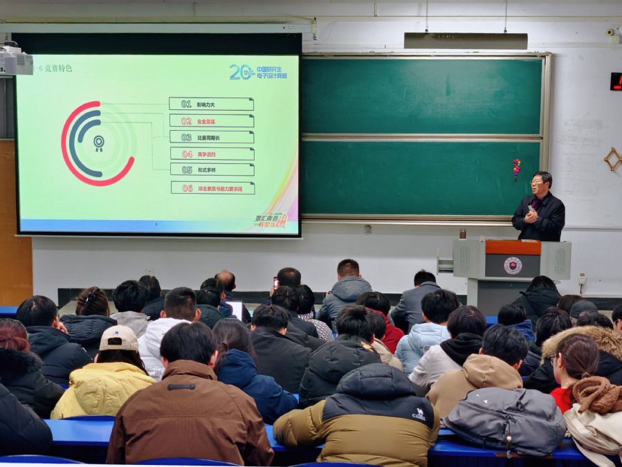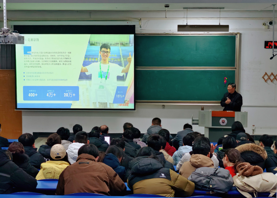 报告会上,袁小平教授结合多年指导全国研究生电子设计竞赛的丰富经验,分析了竞赛与科研能力培养之间的内在联系,围绕赛事选题策略、评审重点、系统化备赛方法以及典型获奖案例展开了深入细致的讲解,并以2025年研究生电子设计竞赛相关赛题为例,剖析了关键技术环节,对自动寻迹、目标识别等模块的设计难点进行了原理讲解与实现流程梳理。此外,袁教授还从竞赛的基本情况、阶段性备赛规划、必备知识储备、团队协作分工等方面,为在场同学构建了清晰完整的备赛框架,强调了在竞赛中培养系统性思维和解决复杂工程问题能力的重要性。