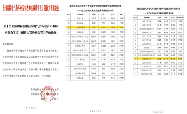 近日,电气工程及自动化学院在第四届全国高校电气类青年教师实践教学设计创新大赛决赛中喜创佳绩,斩获国家级奖项2项。其中,电气工程系教师刘战带领学生赵俊杰、刘轩宁获得电力电子技术应用竞赛全国一等奖,自动化系教师徐止政带领学生徐程、秦亚滨获得电子电工技术应用赛项全国二等奖。学院首次派出2支队伍参赛即取得优异成绩,充分展现了青年教师扎实的专业功底、优秀的实践教学能力和创新水平。