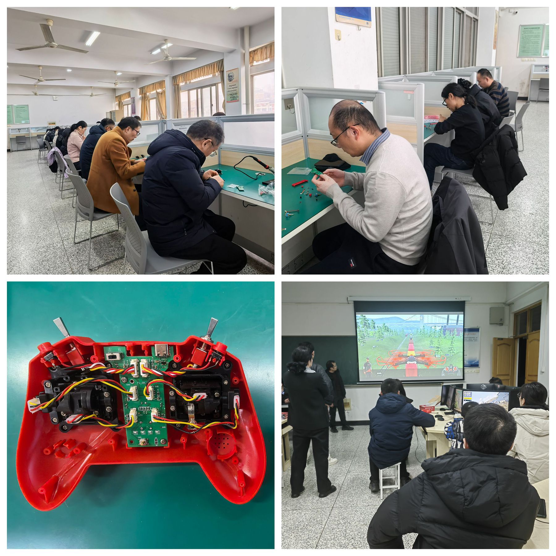 趣味运动会结束后,老师们还到实验室开展了无人机遥控手柄焊接,用自己制作的遥控器进行无人机模拟飞行体验,将专业性和趣味性融为一体。